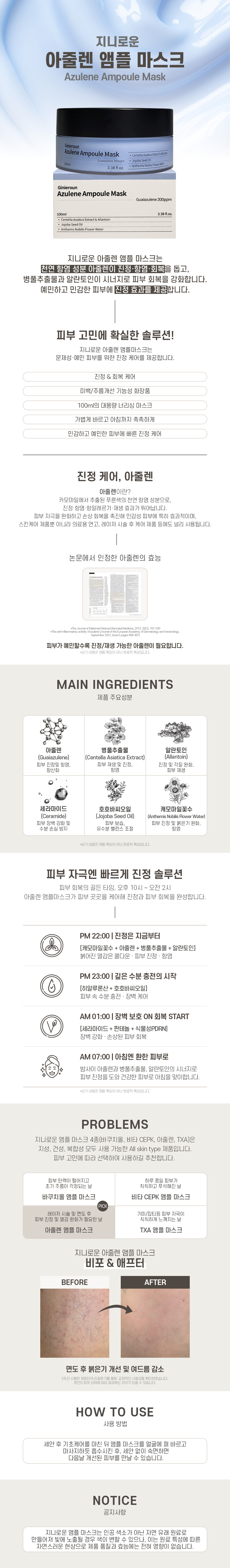 그 중 아줄렌 앰플 마스크는 캐모마일 꽃에서 추출되는 아줄렌과 캐모마일꽃수의 사용, 진정에 효과적인 성분 병풀추출물, 알란토인 4가지의 배합으로 진정과 회복에 집중한 크림팩입니다. 또한 피부 재생을 돕는 원료인 식물성 PDRN을 사용해 피부 관리에 도움을 줍니다.